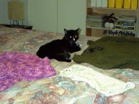 Kissat innostuivat myös uudesta langasta, ne änkesivät itseään lankapusseihin ja kiersivät niitä kuin... öhh... kissa kuumaa puuroa ja nuuskivat ja kävivät etsimässä sittemmin visusti piilotettuja lankapusseja vielä muutaman päivän kuluttuakin siitä paikasta, jossa pussit ensin eteisessä olivat...