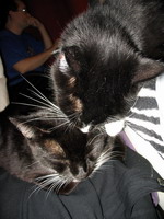 Mini voi hyvin (niinkuin kuvistakin näkee) eikä tiedä olevansa ensi viikolla kissojen Andy McCoy uusien leegojen kanssa... Tai siis hammaskiven poisto taitaa kuitenkin riittää. Antibiootteja syöttänyt Jussikaan ei ole pahasti naarmuilla.