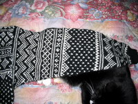 It is ready. There will be no better picture because the pattern will be published in our upcoming knitting magazine in the net, Ulla , in October. In the picture Maxi is looking for at least for one single yarn end he could chew. Sorry, matey, tough luck, all the yarn ends are woven in!