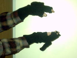 - Autoilijan kannalta paras(?) jatkokehitysajatus oli se, että ompelin kämmeniin tekonahkapaikat, jotta lapaset eivät luista autoa ajettaessa. Paikkoihin tarvittiin noin 10 cm pätkä tekonahkaa (Eurokankaasta) ja sitä jäi reilusti yli... Paikka on suorakulmainen, pyöristin vain hieman kulmia ja ompelin sen kiinni pykäpistoin. (Sen kummempaa koruompelusta siihen ei kai tarvitakaan.)