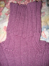Jatka peilikuvana (jotta poolokauluksen esiinkäännetty puoli on 4o, 2n -joustinneuletta): neulo kaulus loppuun 4n, 2o -joustinneuletta, ts. 4 oikean silmukan kohdalla neulo 4 nurin ja 2 nurin olleen silmukan kohdalla neulo 2 o.