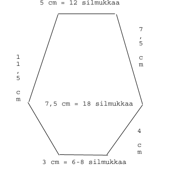 - Kavenna 5/6 kertaa silmukka kummallakin puolella joka kerroksella, kunnes korva on 3 cm leveä tai kunnes silmukoita on jäljellä 6-8. Koko korva on tällöin n. 11,5 cm pitkä.
