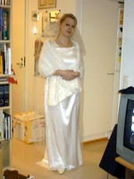 Hunnun taas sanotaan suojelevan morsianta pahoilta hengiltä - alunperin huntu oli niin paksu, että siitä ei nähnyt läpi, joten morsian oli pakko saattaa alttarille. Hunnun ansiosta sulhanen ei nähyt morsianta ennen vihkimistä. Kuvassa testaan pukua hunnun kanssa, mutta jätin kuitenkin loppujen lopuksi hunnun pois. Vieläkin sanotaan, että sulhanen ei saisi nähdä morsianta ennen häitä, sillä se tuo huonoa onnea. Meillä se ei ihan onnistu (eikä sillä ole väliäkään), sillä jotenkin huomasin ns. joutuneeni ompelemaan hääpukuni itse ja Jussi on ollut apuna sovituksessa... Bestman Mikko toi Kiinasta työmatkaltaan silkkiä pukua varten, kiitos siitä hänelle! Puvun ompelusta on myös oma sivu (varoitus: paljon kuvia). Kuulemma myös puvun ompeleminen itse tuo huonoa onnea. Meillä on sitten aika huono-onninen avioliitto tiedossa, olihan kimpussanikin muratteja! Hyvät puolet: