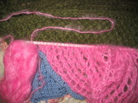 In the picture the green scarf is the original one, the small blue thingy is the swatch with a lace edging and the pink one is another scarf I just started.