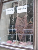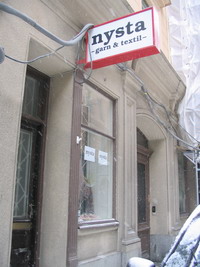 Kirjan jälkeen oli aika suunnata ensimmäiseen lankakauppaan ja olin jo valmis sortumaan. Valmistauduin henkisesti saapumaan Nystaan, sönköttämään huonoa ruotsia ja ojentamaan Visa-korttini ja saamaan vastineeksi Himalaya-silkkilankaa ja ehkä kerän Noroa ja toisen Colinettea ja... Hahmotimmekin itsemme kaupan ovelle ja toinen käteni ojentui ovenkahvaa kohti ja toinen lompakolle.