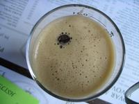 From left to right: banánové, kávové and kopřivové - that is, banana beer (you can see a slice of banana floating there), coffee beer (there's a coffee bean) and the lovely green stuff is nettle beer (no leaves floating that time).