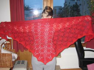 Valmis ja pingotettu Flower Basket Shawl. Ihana! Lankana Emmebi Vogue.