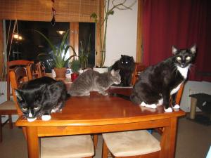 The cats are doing fine and Takku has made himself at home well, almost too well. He lays down on my newspaper in the morning when I try to read it (like Maxi) and he tries to drink water from my glass (like Mini) and he sleeps between my feet (like Frank). So far Takku has not started yelling like Frank or chewing yarn like Mini and Maxi, but he has started punching our cats just to show off. When Takku came, Frank was mostly loud but not aggressive, Mini was slightly afraid of the new cat and Maxi was as neutral as Switzerland and ate the food while the others tried to figure out what the new situation is all about.