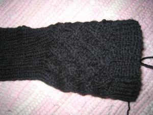 Maija-takin ensimmäinen hiha on jo ylittänyt kyynärpään. Asiantunteva Espoon neuletapaamisten raati vakuutti, että palmikko sopii myös hihansuuhun, joten päätin kokeilla sitä. Raati oli oikeassa! Palmikoiden jälkeen mallineule olisi jatkunut sujuvasti suoraan 4 oikein, 4 nurin -joustimena, mutta se ei kuitenkaan käynyt, koska etukappaleissa joustin on 4 oikein, 2 nurin. Siispä kavensin liiat nurjat silmukat pois. Samaan aikaan sekä epäilin lopputulosta että toivoin parasta ja yllätyksekseni ratkaisu toimi! 4 oikein, 2 nurin -joustimeksi kaventaminen ei tehnyt hihasta trumpetin näköistä tai jollain hassulla tavalla epämuodostunutta. Tykkään!