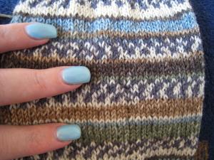 The distance from our place to Jussi's old home is 140 kms. The drive there lasts approximately for 1 hour 40 minutes and consists of all kinds of roads from motorways to sand roads. Jussi's sock has 72 stitches per round. During the drive you can knit 42 rounds, that is, 3024 stitches. That equals to an average of 21,6 stitches per kilometre. In addition to that, my nail polish matches the sky blue stripes perfectly.