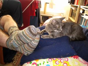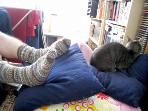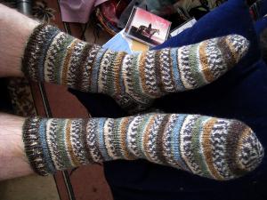 Comments from the knitter: the yarn was OK and the stripes behaved nicely and symmetrically until the very end of the second sock toe. There you can see some blue and in the first sock toe you cannot.