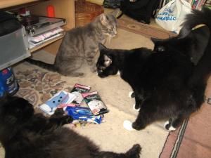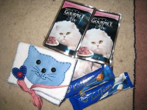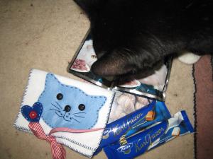 Paketissa oli suklaata (nam!), kissanruokaa (nam nam!) ja kangasvihkonen neuloja varten. Viimeinkin saan neulani järjestykseen, tähän mennessä ne ovatkin lojuneet epämääräisissä kasoissa vähän missä sattuu. Kiitos, Teija sekä Roope, Reetta ja Rasmus ja varsinkin Nekku! Nekun yksivuotissynttärien kunniaksi jaossa oli paketti, joka saapui nyt meille. Mini, Maxi, Frank ja Takku kiittäisivät myös, jos ruoan mussutukseltaan ehtisivät... ja minäkin taidan siirtää ahnaat sormeni tästä näppikseltä pahaa-aavistamattoman suklaan kimppuun. Mmm. Tämä tuli tarpeeseen.