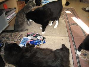 Tervehdys Tampereelta saapui tänään postissa. Kutsuin kissat tutkimaan sen sisältöä...