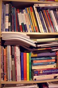 Ihailen noita siistejä lankahyllyjä ja kadehdin tuota kirjarivistöä :)