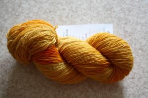 Here it is, look! I would almost like to say "neener neener" after I read that the four kilo lot of this yarn was sold out in an hour in Ilu's shop. I don't, because I did not have to fight for this yarn, in fact, when I got this yarn I had no idea of the whole phenomenon it was about to be. The postman brought this yarn to our place one morning and I was happy to get another shipment from the TitiTyy sock yarn club. I just looked at the yarn and thought, "Oh, what a lovely orange... and oh, the wool is local, too."