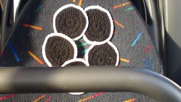 The back of the bus was also decorated with knit graffiti and white and black crocheted circles.