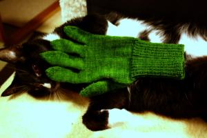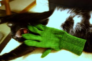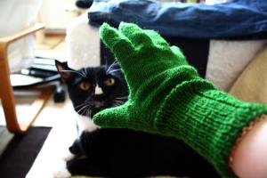 The green monster glove stalks at the non-suspecting cat.