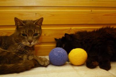 Crocheted balls strike again, this time in yellow and blue, and the unsuspecting cats were made photo models in the middle of their nap in the sauna... Frank disapproved, Takku was not interested at all.