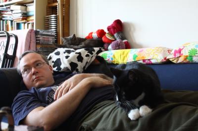 The engineer relaxes on the sofa after piling up some yarn on the cat.