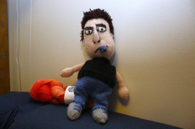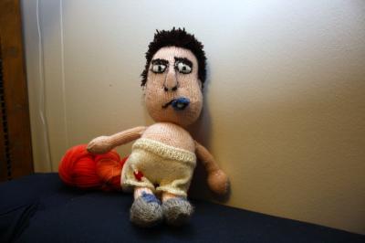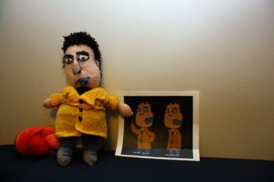 Yes, I am knitting cartoons again. This is a police officer called Kyösti Pöysti from the Finnish series Pasila. In this season's second episode Kyösti suffered from frustration as he felt he had not achieved anything, for example written a successful novel. That reminded me of my husband and so I had to knit Kyösti Pöysti for him. Jussi insisted that Kyösti must have boxer shorts so I knitted those, too. The yarn was Viking Baby Ull from Lankamaailma Nordia and I made up the pattern as I went.