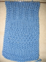 Lanka on Schachenmayr Nomotta Blue Jeans Cable, ja ilokseni huomasin toissapäivänä mallitilkkua väsätessäni, että farkkulankaa neulotaan 4,5 mm puikoilla eikä 3,5 mm puikoilla niinkuin muistelin. Työ eteni nopeasti! Kuvassa alhaalta ylös pari kerrosta aina oikeaa, sileää, 1o, 1n - helmineuletta, kahden kerroksen helmineuletta, 2o, 2n -korinpohjaneuletta, sileää, tunturineuletta ja 3o, 1n -neuletta. 3o, 1n näyttää hyvältä nurjalla puolellakin: 3n, 1o sopii hyvin yhteen tunturineuleen kanssa.