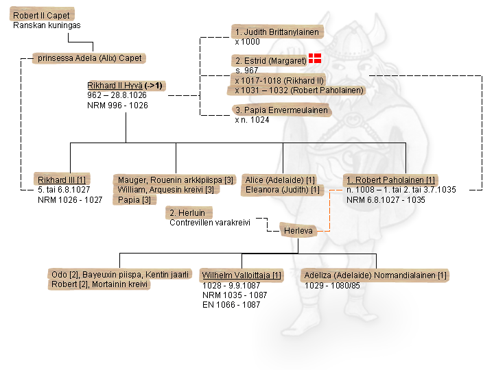 Rollo oli viikinki, jolle Länsi-Frankkien kuningas Kaarle Yksinkertainen antoi Normandian hallittavaksi vuonna 911 sillä ehdolla, että Rollo puolustaa Länsi-Frankkeja muiden viikinkien hyökkäyksiä vastaan. Rollon pojan Wilhelm Pitkäpuukon kuoltua Länsi-Frankkien kuningas Louis IV vangitsi Rikhard I Pelottoman Laoniin. Louis IV ja kreivi Hugh Suuri taistelivat Normandian hallinnasta Rikhard I:n vankeuden ajan. Harald Sinihammas vapautti Rikhard I:n 945 ja pakotti Louis IV:n tunnustamaan Rikhard I:n herruuden Normandiassa. 946 Rikhard I sai Rouenin hallintaansa. Rikhard I joutui vielä taistelemaan muutaman vuoden ennen kuin sai koko Normandian hallintaansa.